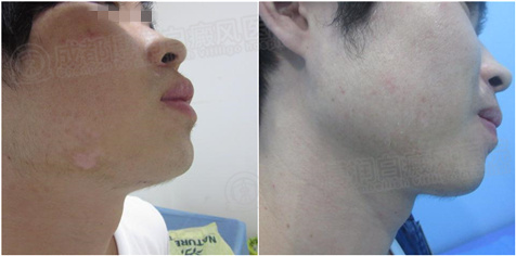 患者朱浩(化名)于一年前发现脸部白斑,因面积过小并未放在心上,一年后白斑却开始扩散,患者连忙联系到我院住院强化治疗,由于白斑控制的及时,日前已成功祛除了白斑。