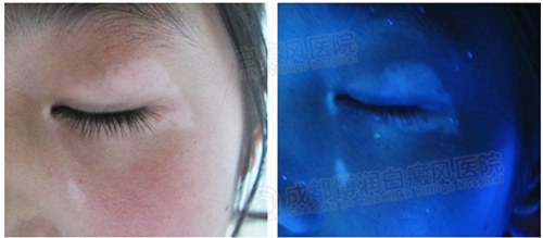 ▲wood灯:左侧眼周 有斑片状色素脱失性白斑,边界不清晰