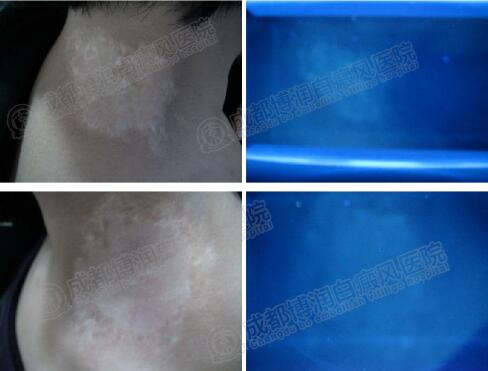 wood灯:颈部有斑片状色素脱失性白斑,边界不清晰