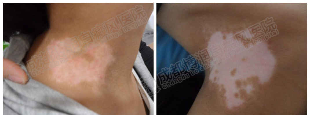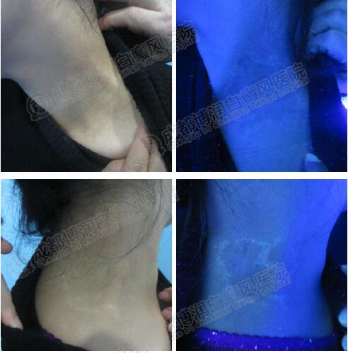 现病史:患者3年前发现颈部白斑,先在华西医院治疗,后于当地医院用偏方治疗,治疗效果不明显,后来我院治疗。