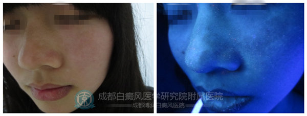 ▲病史:患者2月前发现面部出现不同程度色素脱失,曾在其他医院治疗,使用外用药(药名不详)、口服药,效果不佳,近来白斑扩散加快,今日来我院就诊。