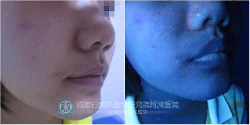 5、wood灯:面部有斑片状色素脱失性白斑,边界不清晰