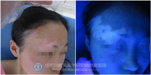 5、wood灯:右侧眉部 颞部 头部 均有不同程度斑片状色素脱失性白斑